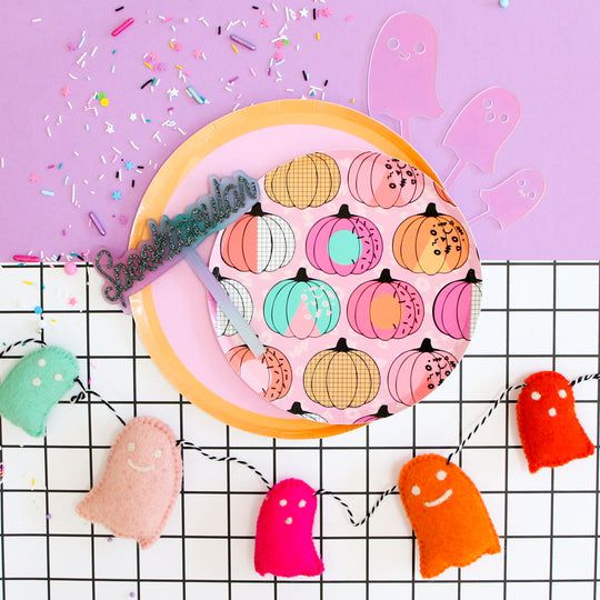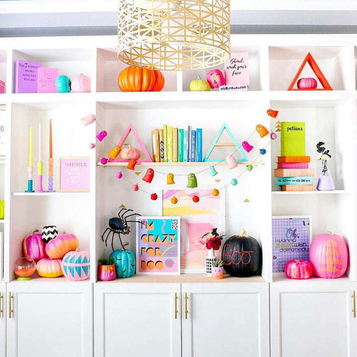 Who says Halloween has to be scary and dark? Our colorful felt ghost garland measures 6' long and has 8 (alternating 3"and 4") felt ghosts spaced across it. Perfect for bright and cheerful Halloween decor!